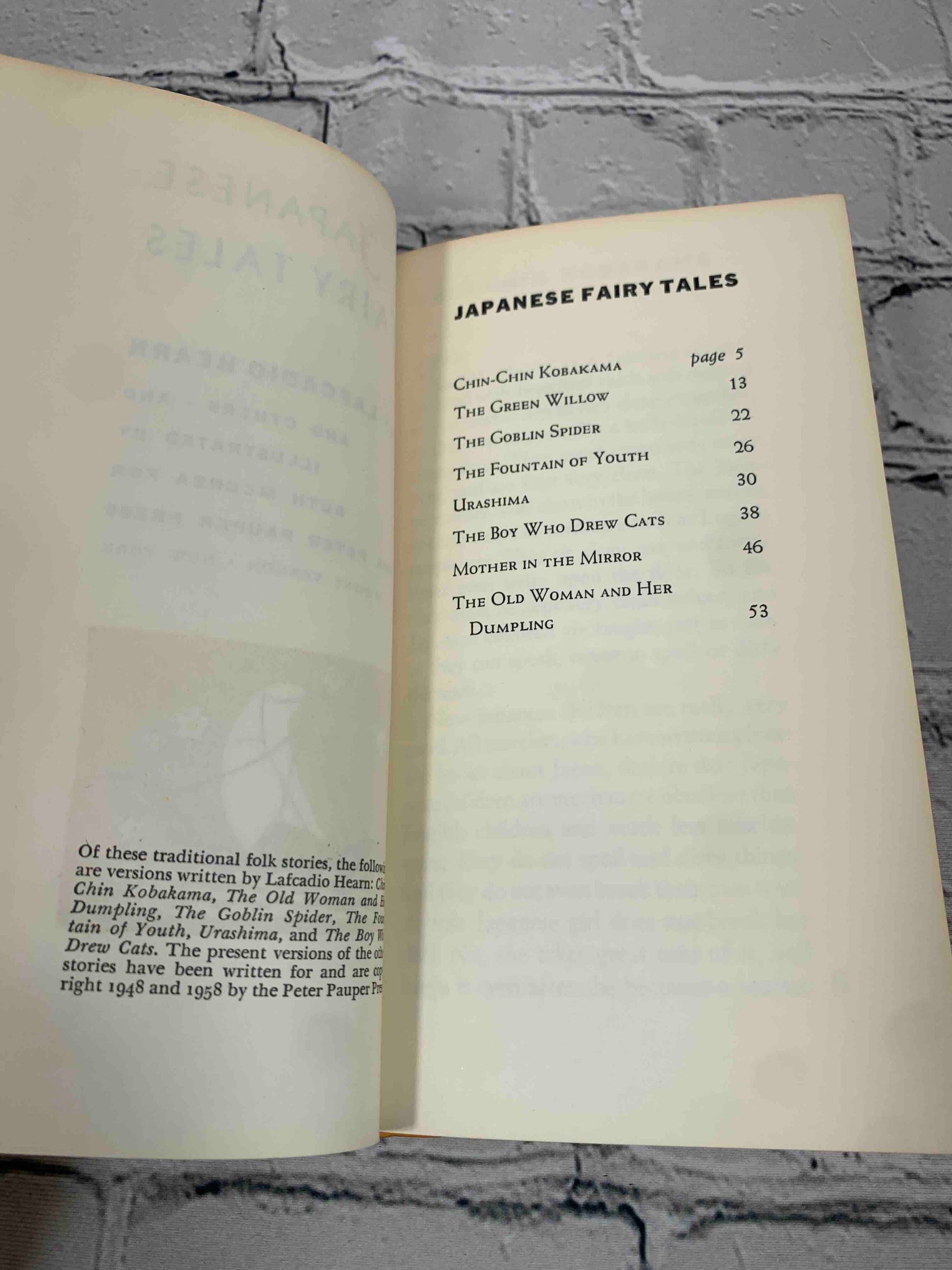 A mid-20th century illustrated collection of traditional Japanese folk and fairy tales, published by the Peter Pauper Press, known for its high-quality decorative book production. This edition draws largely from the writings of Lafcadio Hearn, who helped introduce Japanese folklore to Western audiences.