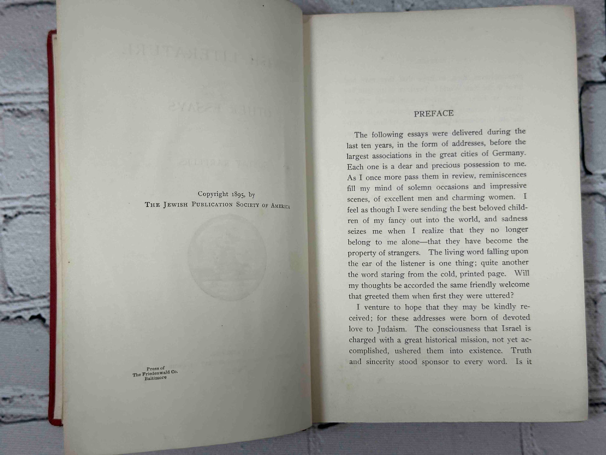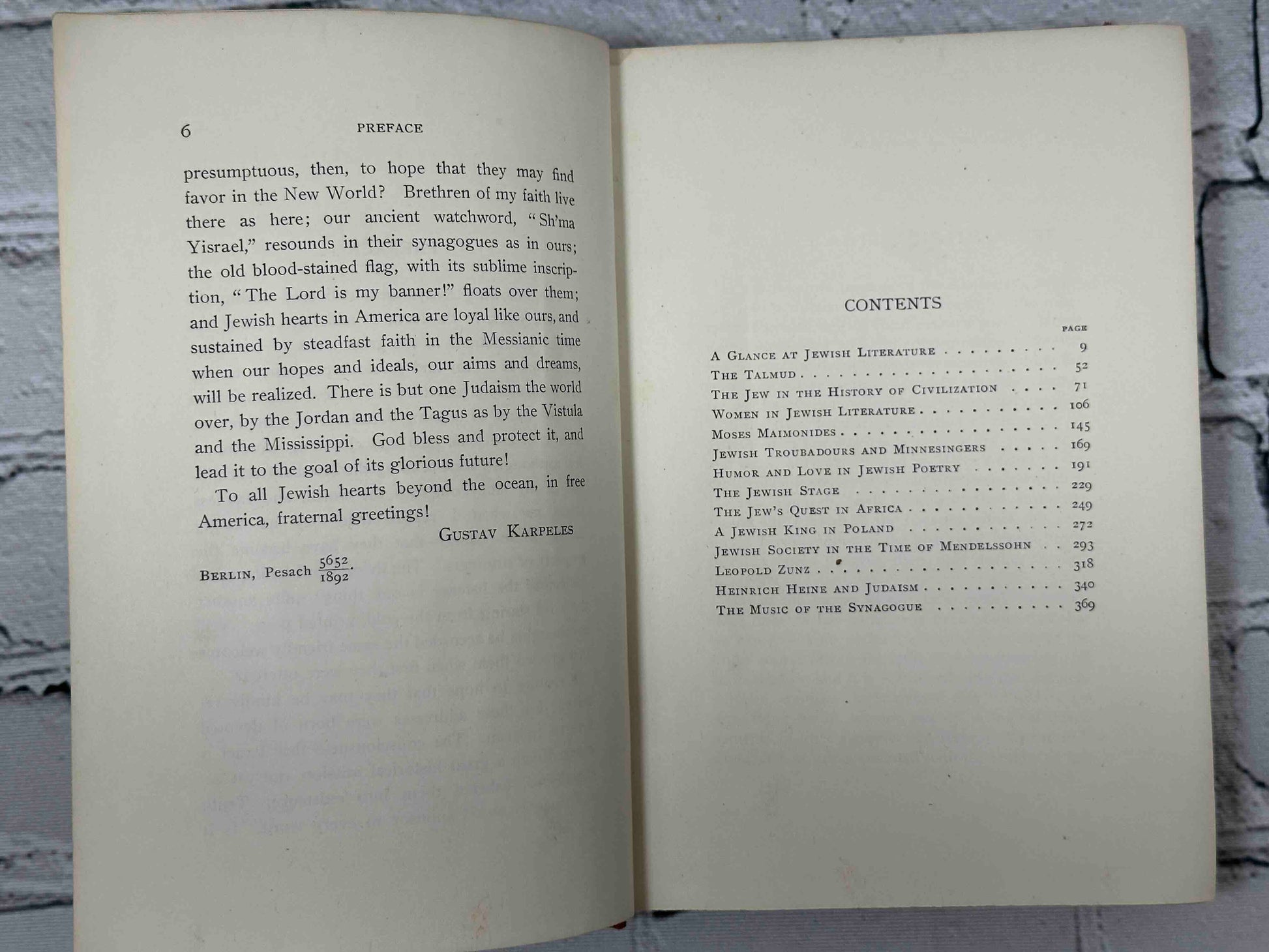 I venture to hope that they may be kindly received; for these addresses were born of devoted love to Judaism. The consciousness that Israel is charged with a great historical mission, not yet accomplished, ushered them into existence. Truth and sincerity stood sponsor to every word. Is it presumptuous, then, to hope that they may find favor in the New World? Brethren of my faith live there as here; our ancient watchword, "Sh'ma Yisrael," resounds in their synagogues as in ours; the old blood-stained flag, with its sublime inscription, "The Lord is my banner!" floats over them; and Jewish hearts in America are loyal like ours, and . sustained by steadfast faith in the Messianic time when our hopes and ideals, our aims and dreams, will be realized. There is but one Judaism the world over, by the Jordan and the Tagus as by the Vistula and the Mississippi. God bless and protect it, and lead it to the goal of its glorious future!