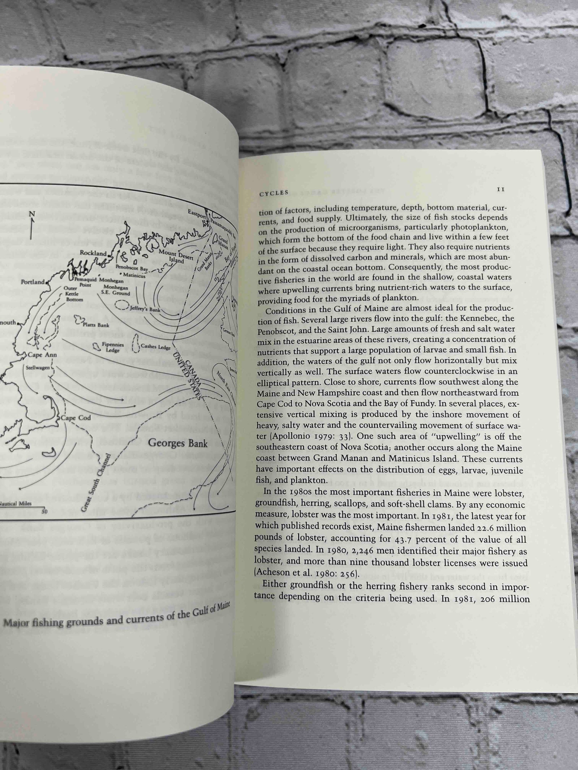 James Acheson’s detailed account of lobstering in Maine quickly dispels notions that the lobstermen is the eastern version of the cowboy, struggling alone for survival against the elements. In reality, he writes, “the lobster fisherman is caught up in a thick and complex web of social relationships. Survival in the industry depends as much on the ability to manipulate social relationships as on technical skills.” Acheson replaces our romantic image of the lobsterman with descriptions of the highly territorial and hierarchical “harbor gangs,” daily and annual cycles of lobstering, intricacies of marketing the catch, and the challenge of managing a communal resource.