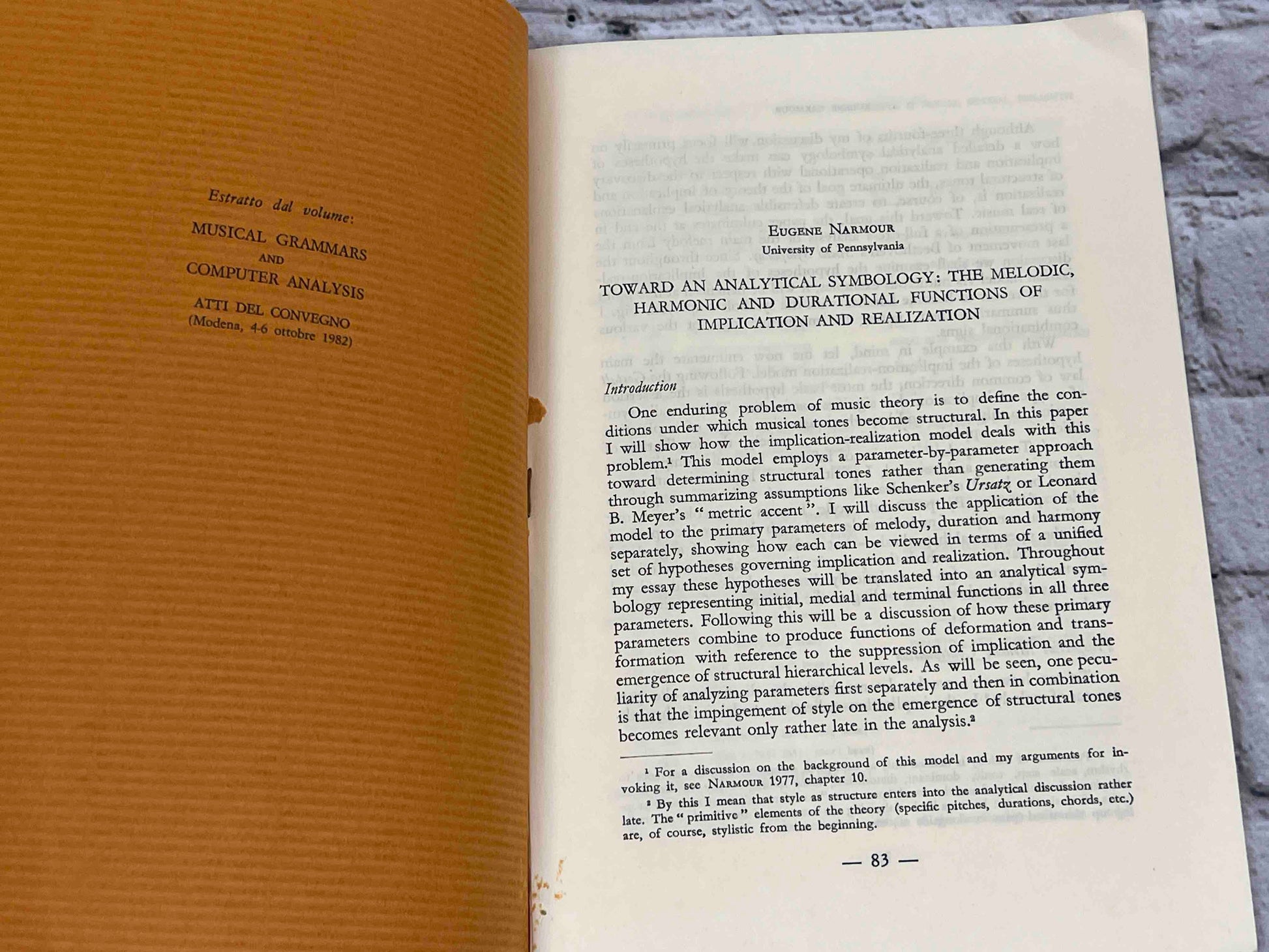 A groundbreaking scholarly essay originally presented in 1982 (and later published in 1984), this work lays the foundation for Narmour's influential Implication–Realization (I‑R) model. It introduces a sophisticated symbolic system designed to analyze how melodies, harmonies, and rhythms evoke listener expectations—capturing whether these expectations are met or subverted. Narmour demonstrates how three core structures—process (P), reversal (R), and return (aba)—and their derivatives govern musical perception across multiple parameters, including melody, harmony, and duration.